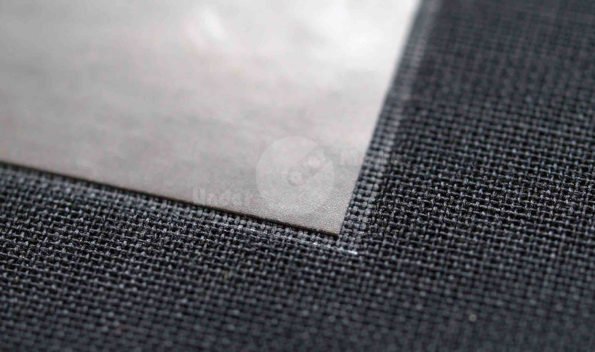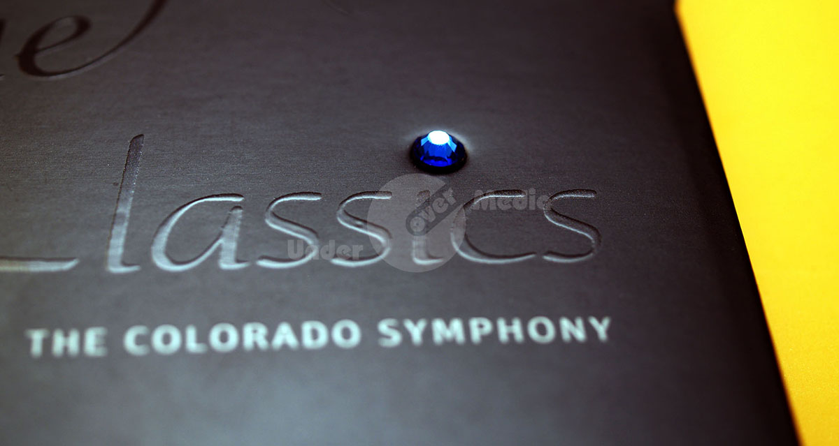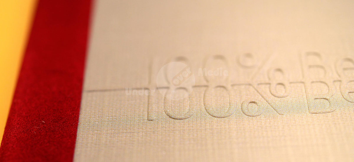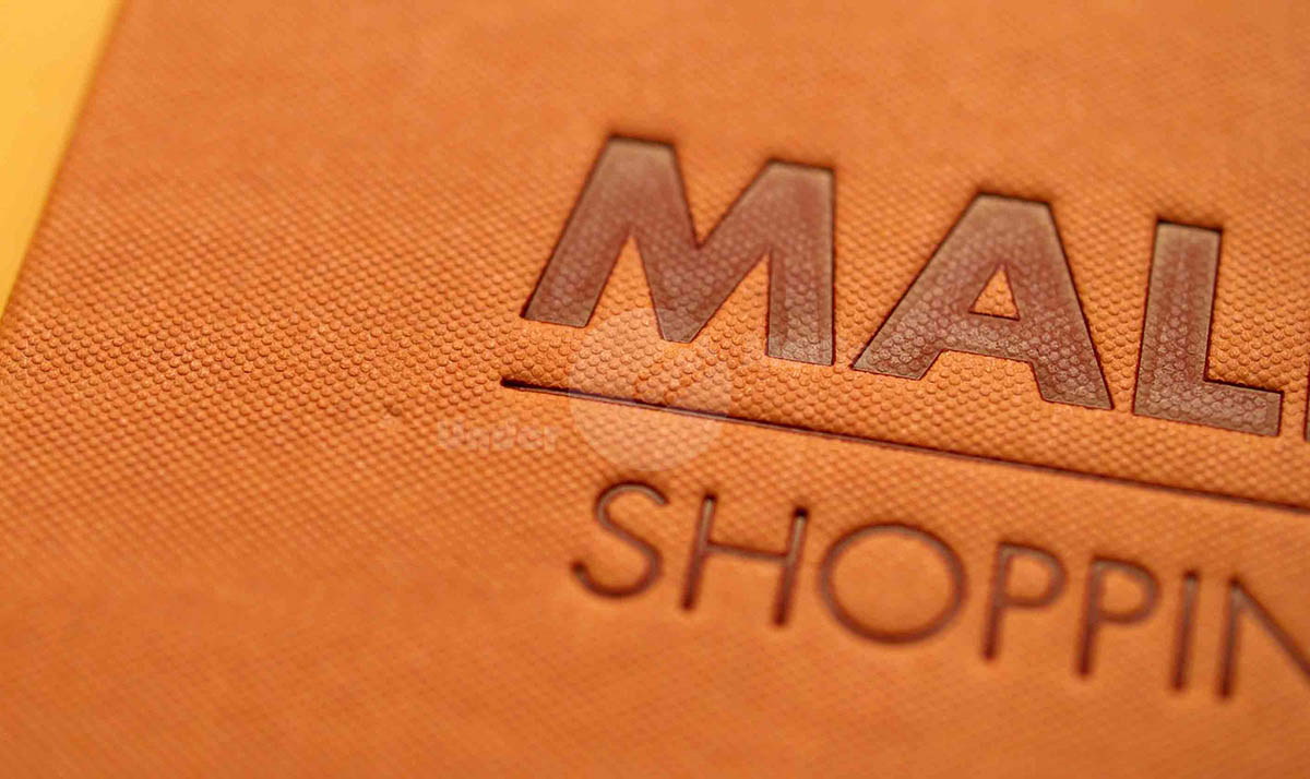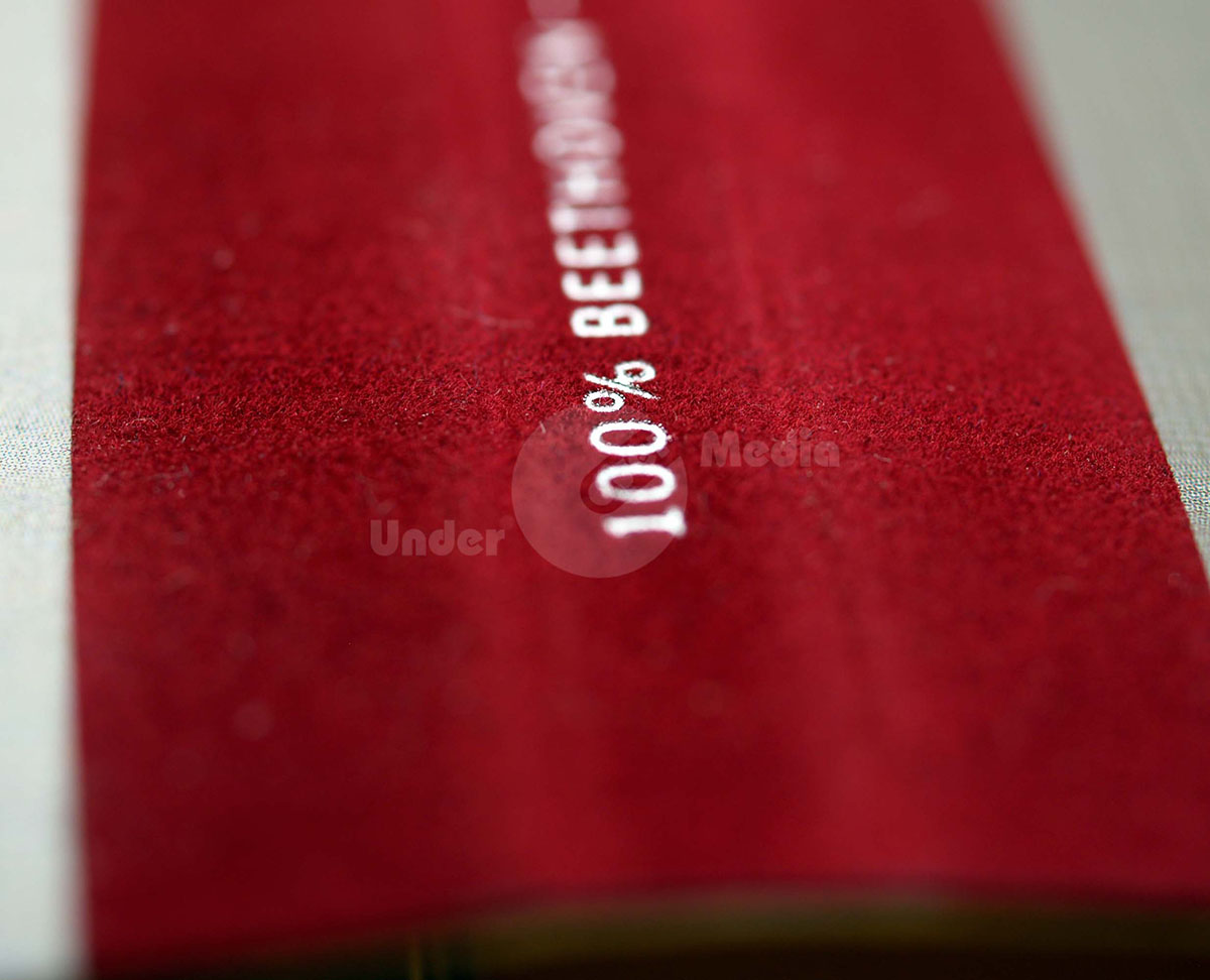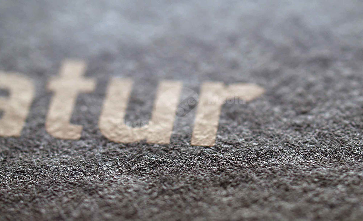 - Das Kundenlogo wurde mit silberner Heißfolie geprägt, die sowohl matte als auch glänzende Elemente enthält, und ein Text wurde ausgespart.