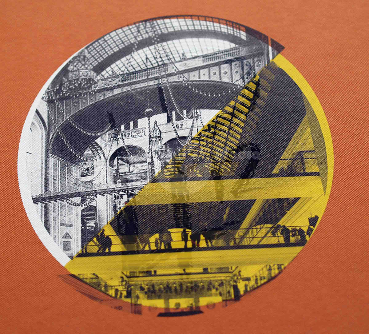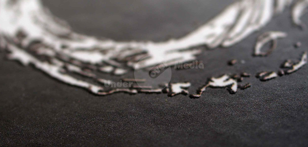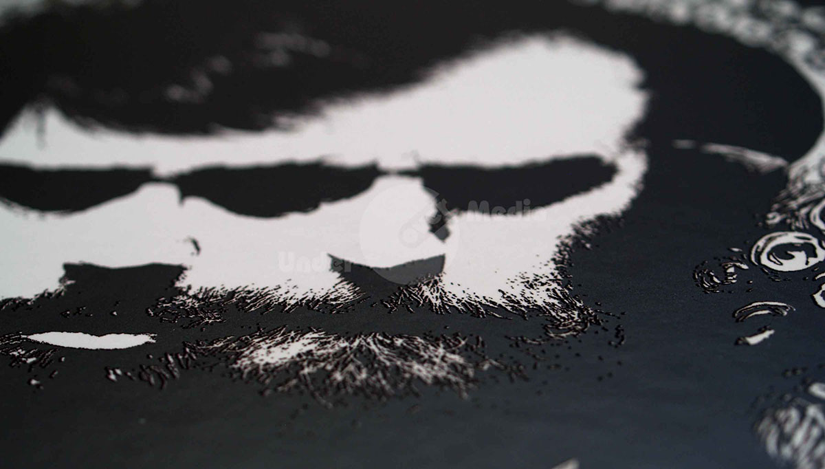 - Mehrstufiger Druck auf das Bezugsmaterial: Siebdruck (Gelb/Weiß), UV-Offsetdruck (Schwarz), Siebdruck (Glanzlack Logo LP12).
