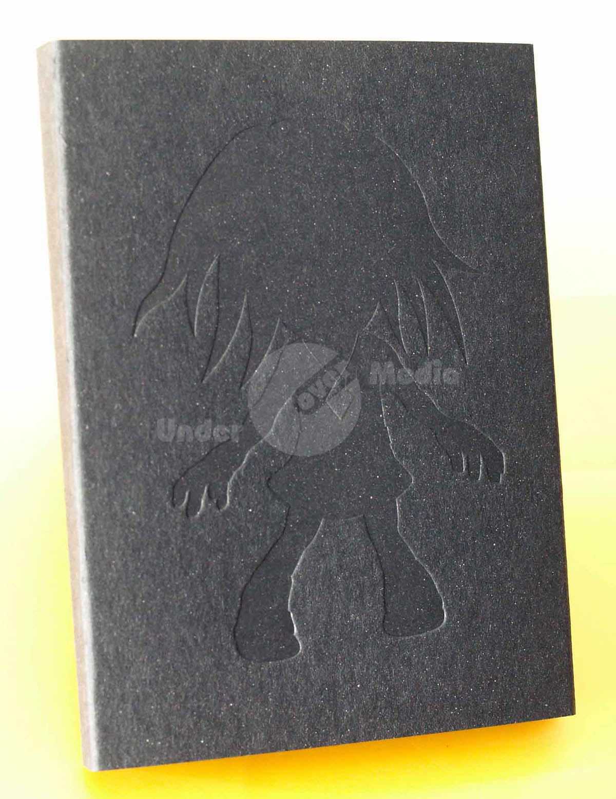 - Der Titel auf der Vorderseite ist in den Karton geprägt.