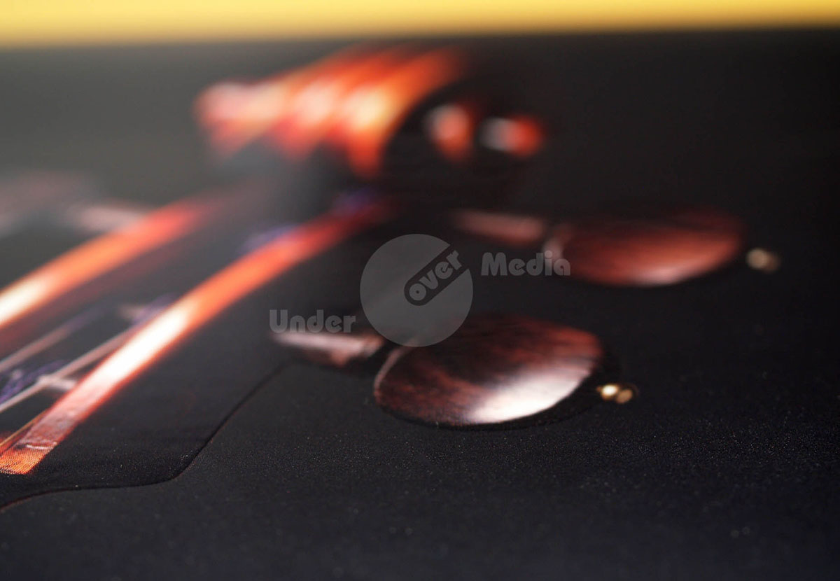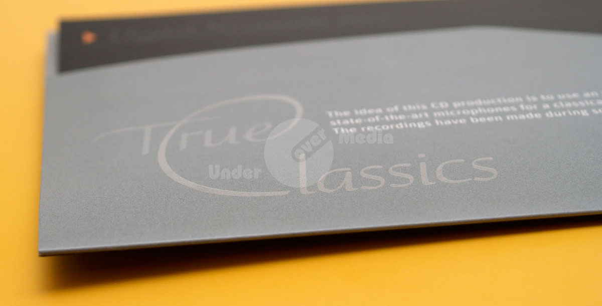 - Die Vorder- und Rückseiten erhielten eine Mattfolienkaschierung, ergänzt durch partielle Glanzfolie auf dem Namen und dem Instrument.