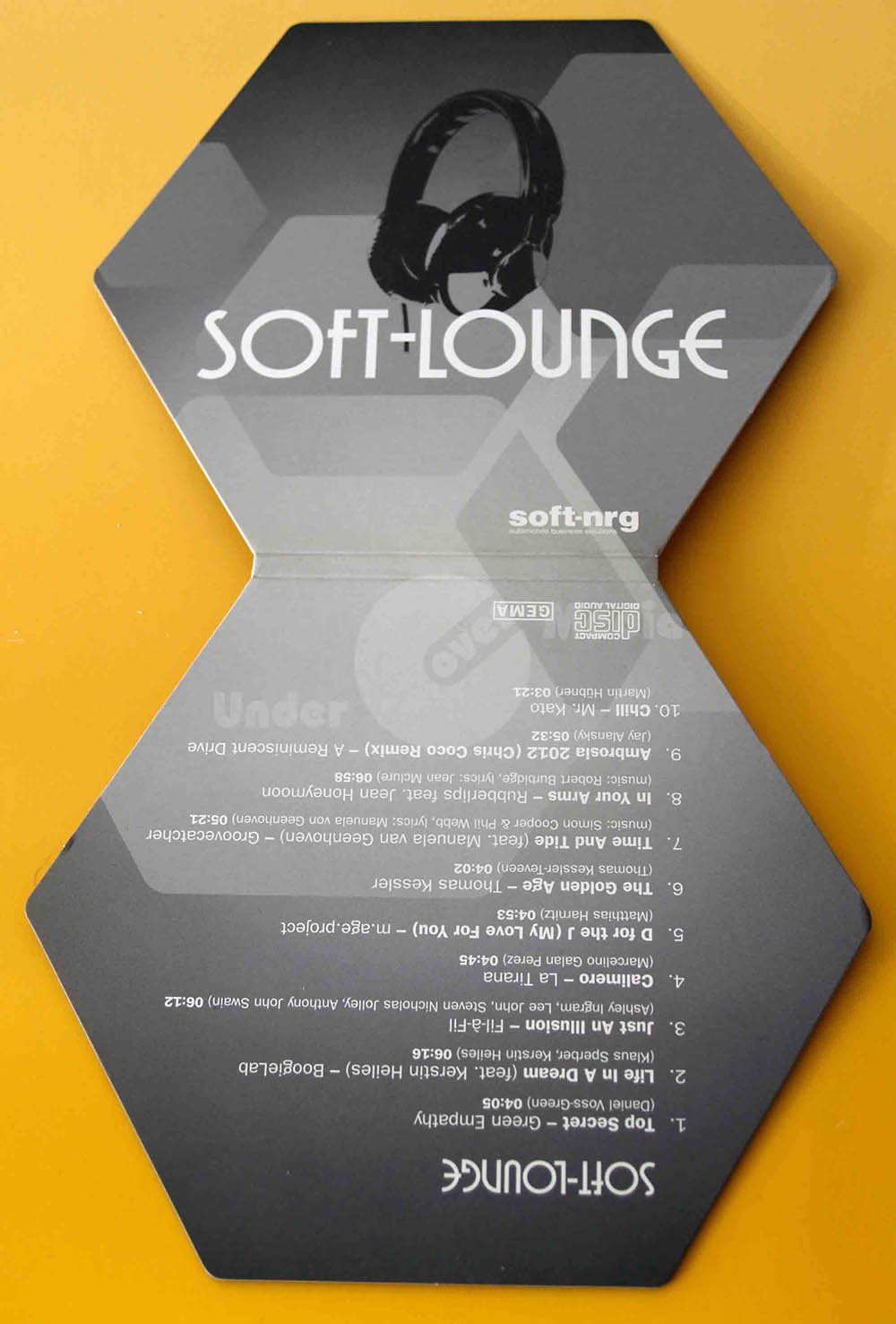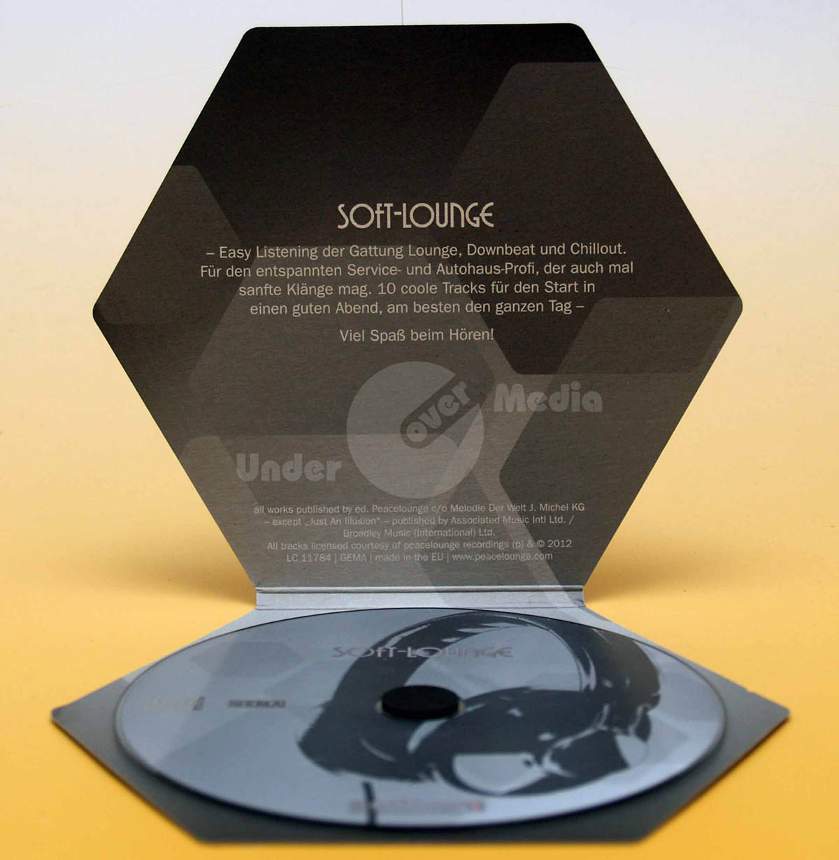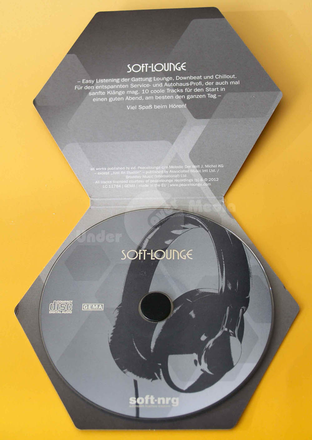 Bei dieser Sonderanfertigung entwickelten wir eine 6-eckige Verpackung für eine CD, inklusive individueller Zusammenstellung von "Lounge"-Musik: