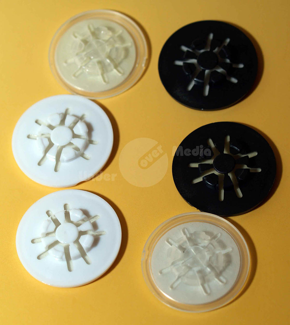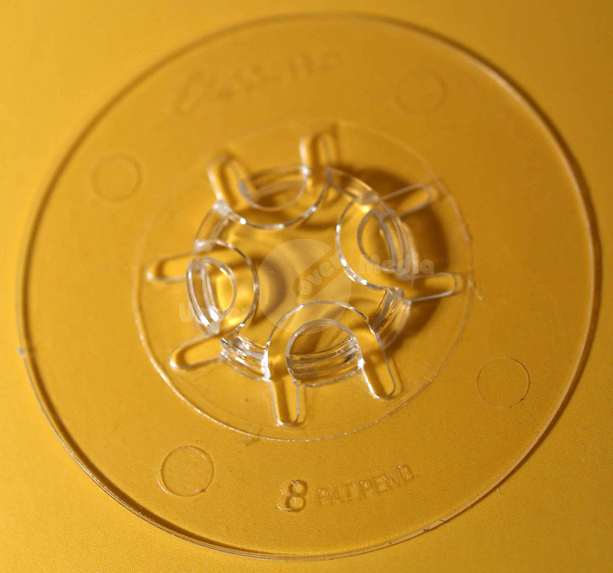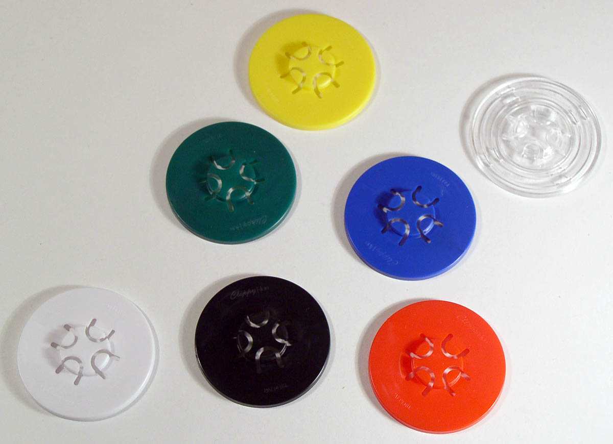 Haltepunkte für Medien mit Mittenloch von 15 mm umfassen Halterungen aus Moosgummi, Schaumstoff, Plastik und Gummi, die selbstklebend oder nichtklebend sein können. Manche fassen genau eine Disc, während andere mehrere halten können.