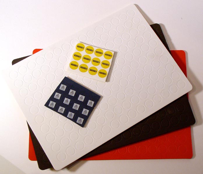 Moosgummipunkte lassen sich individuell bedrucken. Sie eignen sich für DigiPacs, Buchbeilagen oder Sonderproduktionen wie spezielle DVD-Verpackungen. Sie können auch zur Befestigung in Boxen mit Beigaben verwendet werden.